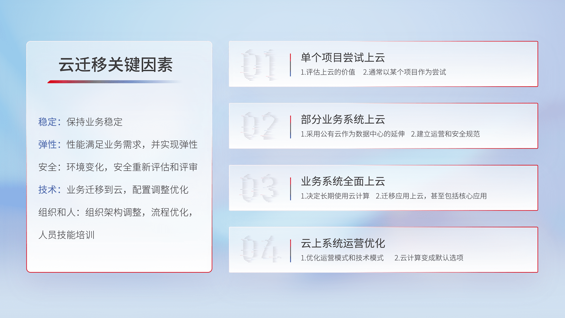 结合实际业务,,,,从规划设计、、云平台选型、、、云原生改造、、数据迁移、、、、集成交付,,,,迁移全过程为客户识别最佳上云路径,,,做好风险识别管理,,设计网络架构、、、、身份权限、、、安全审计合规、、、操作审计、、日志审计、、、、监控告警策略、、、、多站点容灾设计等,,,,对云上基础设施进行整体规划,,,提升IT治理水平,,以满足弹性、、、、高可用、、高性能的需求。。
