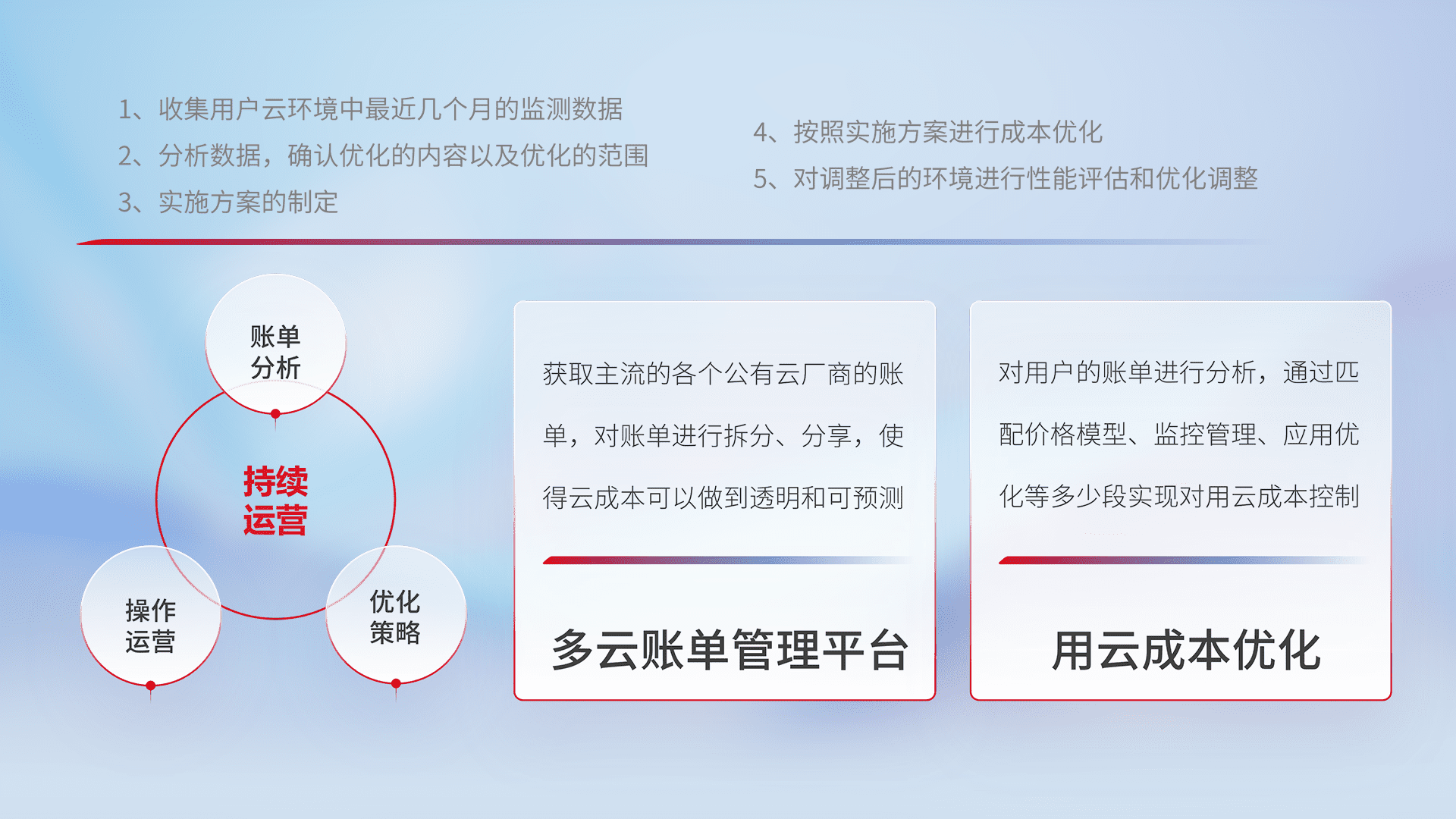通过多云纳管,,以统一的资源数据模型把客户的云资源进行抽象和封装,,,进而实现对多云资源的统一操作,,保障云资源管理的可靠性、、稳定性与可用性。。量身定制化运维内容,,,配置、、、开发运维、、、、补丁管理、、备份、、、监控、、认证和访问管理、、、审计和日常巡检等,,保障在用云过程中的可靠度,,稳定度以及高可用率。。。。