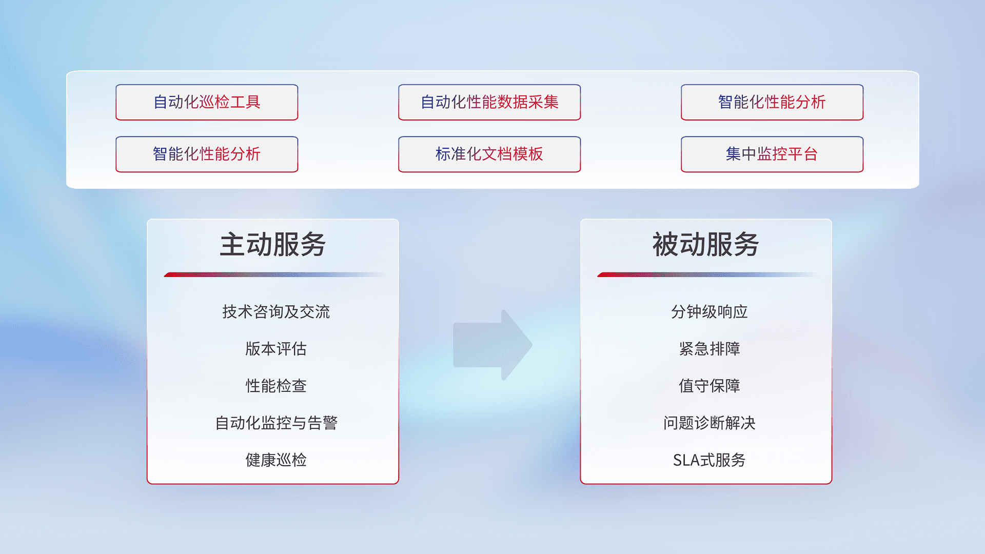 智能化工具和标准化文档,,,保障服务质量,,提供主动服务(包含技术咨询、、版本评估、、、、性能检查、、、自动化监控与告警、、健康巡检)和被动服务包含(分钟级响应、、、、紧急排障、、、值守保障、、、、问题诊断解决、、SLA服务)。。