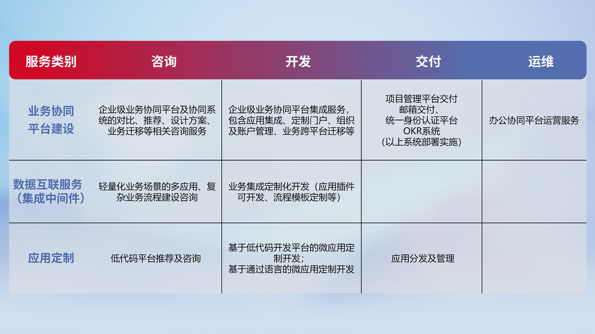 针对钉钉、、、企微、、、IDaas等平台级产品提供产品的规划、、、、方案、、、交付、、、定制化开发等服务,,,,实现如统一协同办公、、、、智能客户服务、、、、混合会议管理、、、、智能数据查询、、等业务场景,,实现数字化转型。。